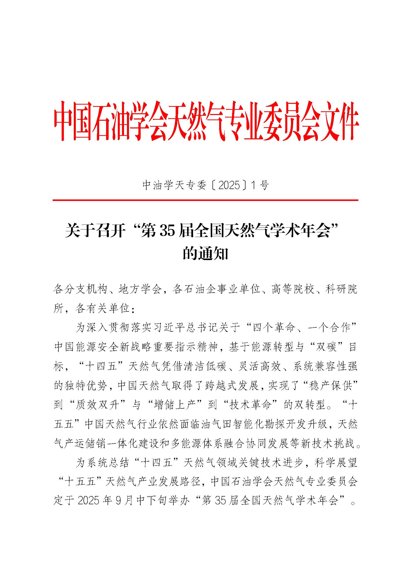 关于第35届全国天然气学术年会的通知