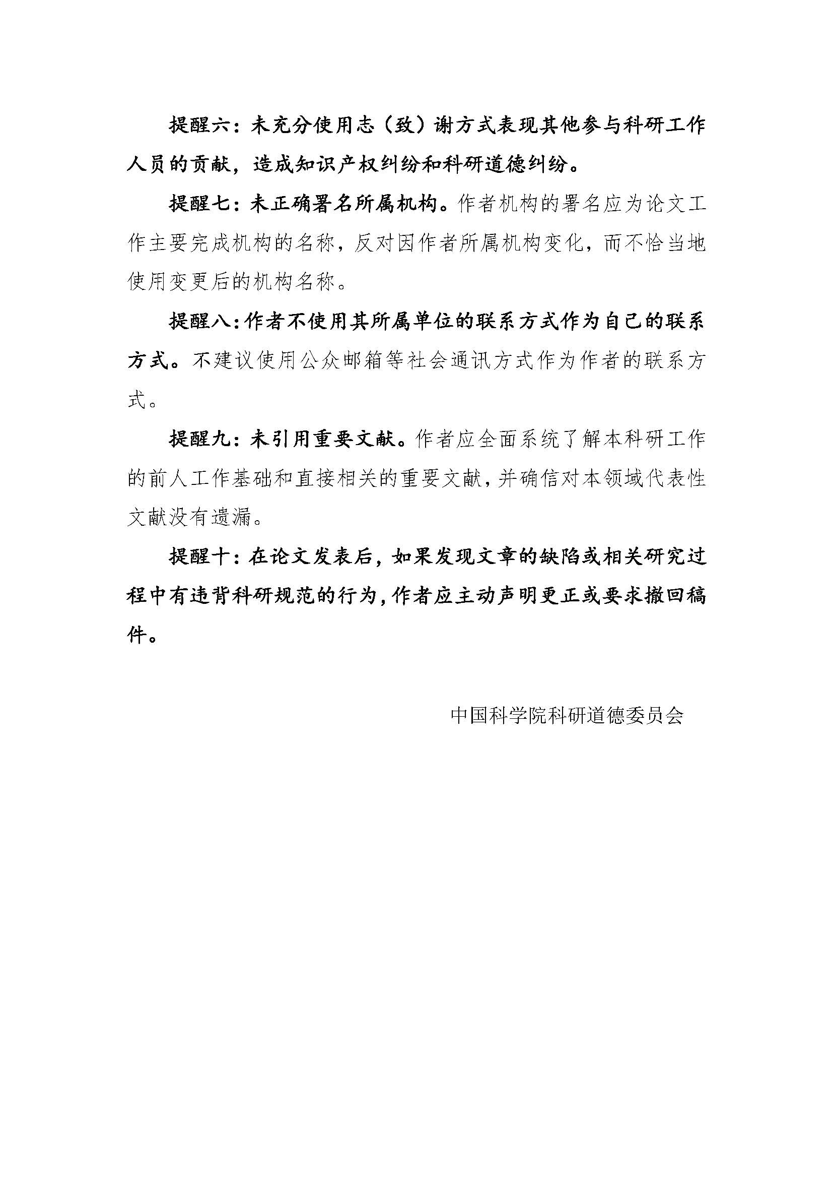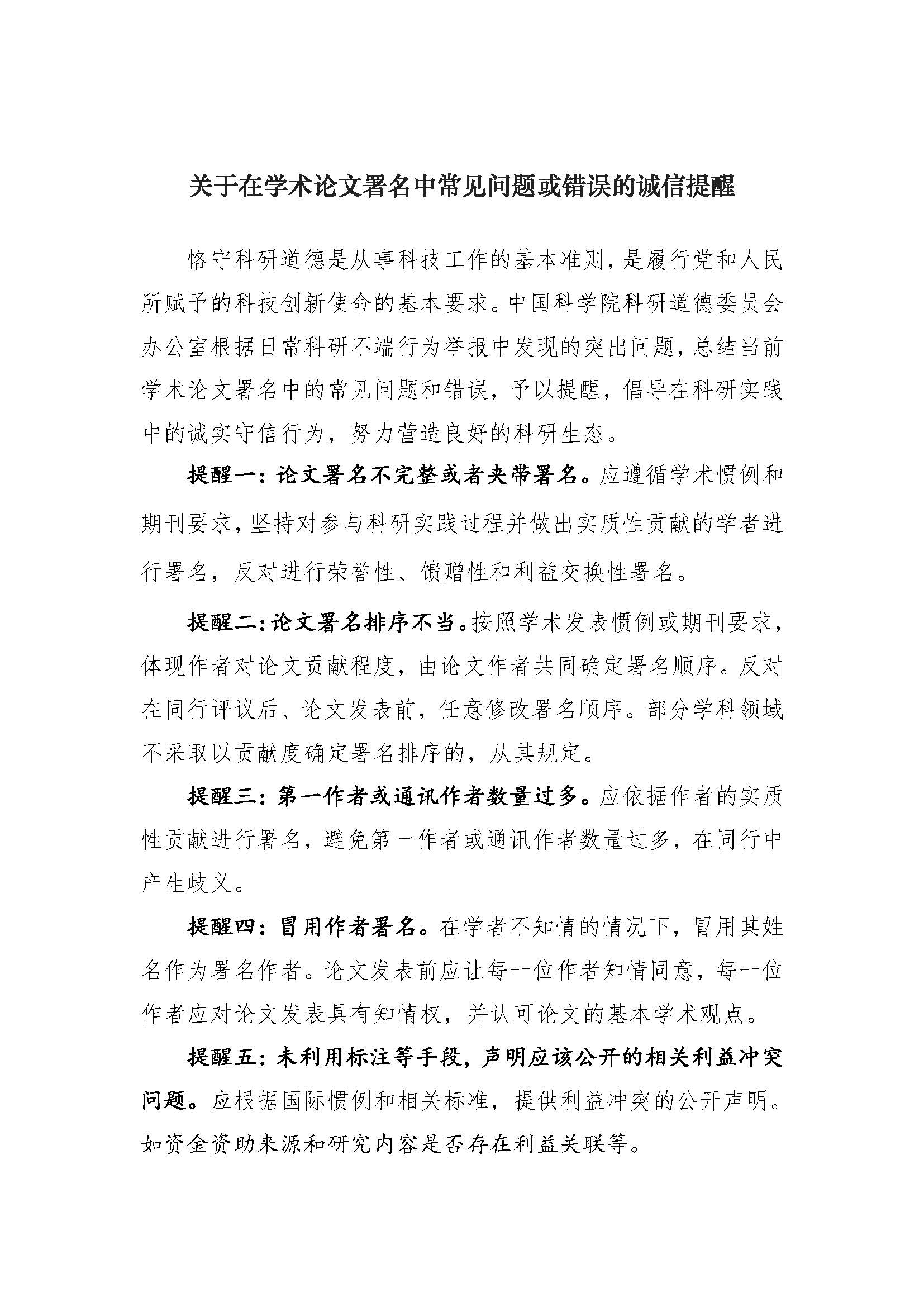 关于在学术论文署名中常见问题或错误的诚信提醒